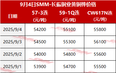 【SMM价格】2025年9月4日长振黄铜棒价格