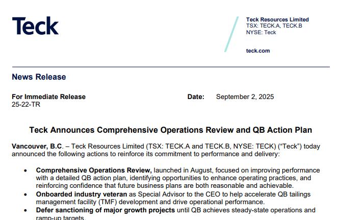 泰克称于8月启动此项审查程序,旨在全面提升公司绩效,预计将于10月完成审查,并在第三季度财报中更新预测。泰克在另份邮件中表示,公司将持续推进加拿大Highland Valley矿区的扩建项目,施工进度按原计划进行。
