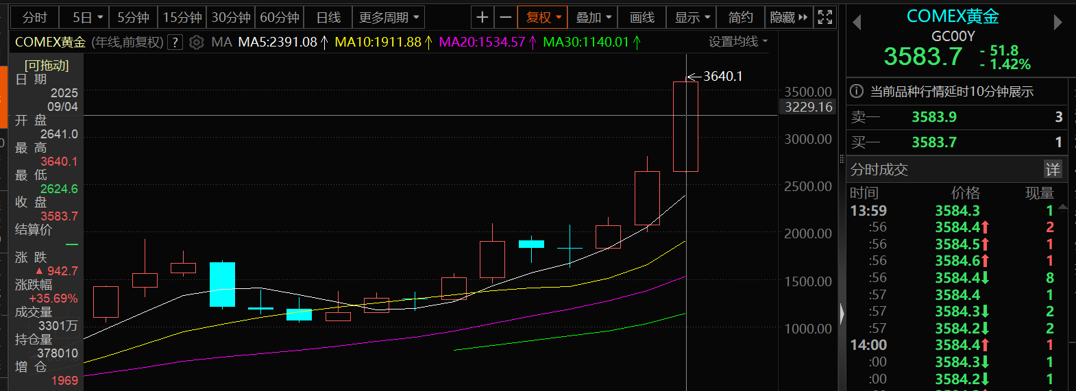 上半年得益于金价的上涨,不少黄金企业的业绩出现了上涨。COMEX黄金在9月3日刷新了历史新高至3640.1美元/盎司之后,9月4日出现了下调,截至9月4日14:10分,COMEX黄金跌1.42%,报3583.7美元/盎司,其今年的年线涨幅暂时涨35.69%。