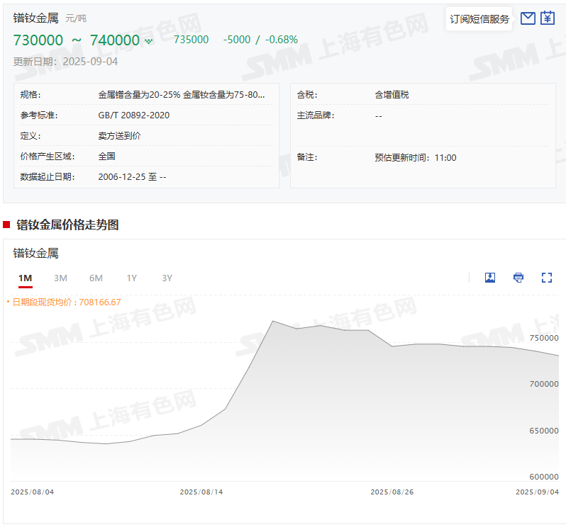 在经历了前期的持续上涨之后,稀土市场部分品种近来迎来了弱势调整。据SMM报价显示,9月4日,镨钕金属价格下调至73-74万元/吨,金属镝价格稳定在2050~2070元/千克,金属铽报价下调至在9150~9200元/千克。