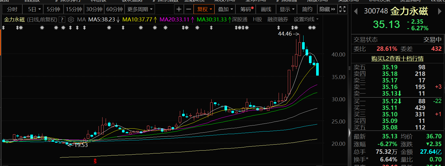 9月4日,金力永磁出现下跌,截至4日14:27分,金力永磁跌6.27%,报35.13元/股。