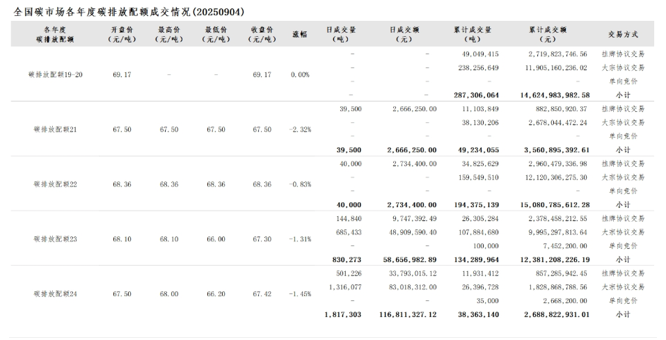 截至2025年9月4日,全国碳市场碳排放配额累计成交量703,568,362吨,累计成交额48,336,696,144.67元。