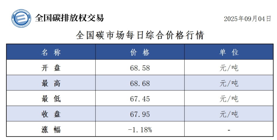 今日全国碳市场综合价格行情为: 开盘价68.58元/吨,最高价68.68元/吨,最低价67.45元/吨,收盘价67.95元/吨,收盘价较前一日下跌1.18%。