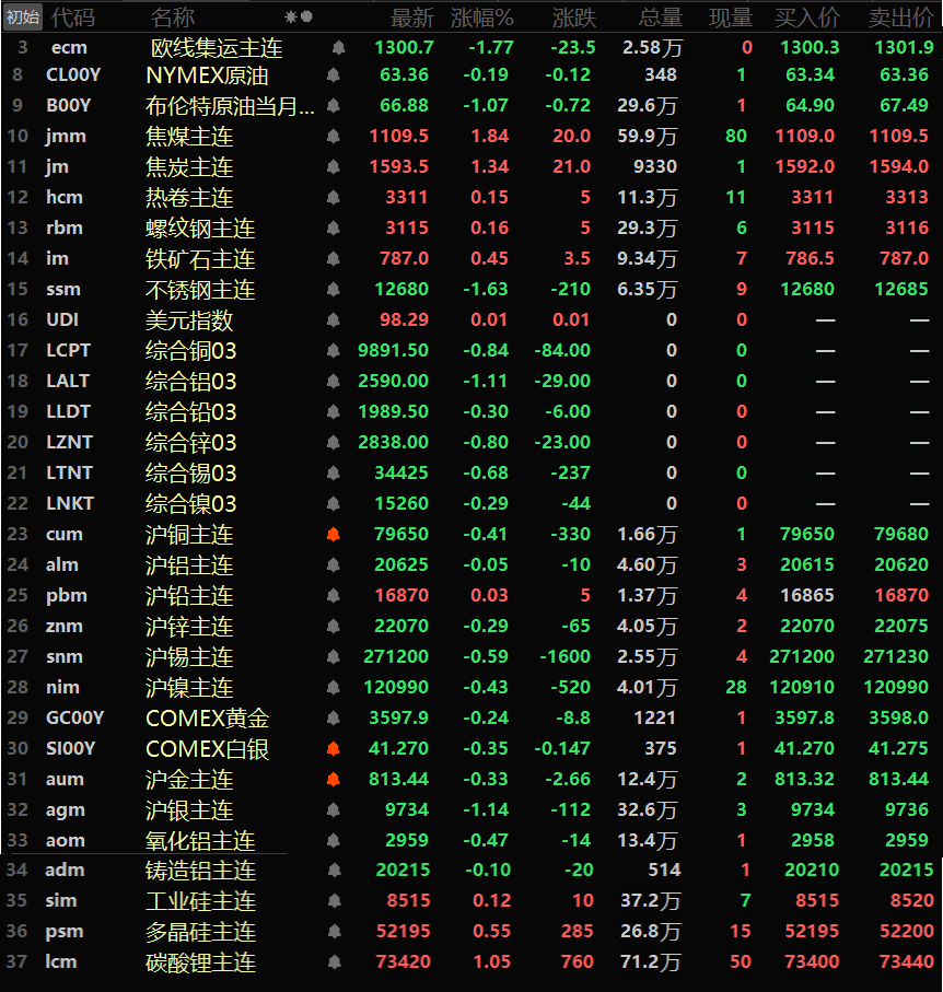 黑色系方面多飘红,仅不锈钢跌1.63%,铁矿涨0.45%。螺纹、热卷涨幅波动不大。双焦方面,焦煤涨1.84%,焦炭涨1.34%。