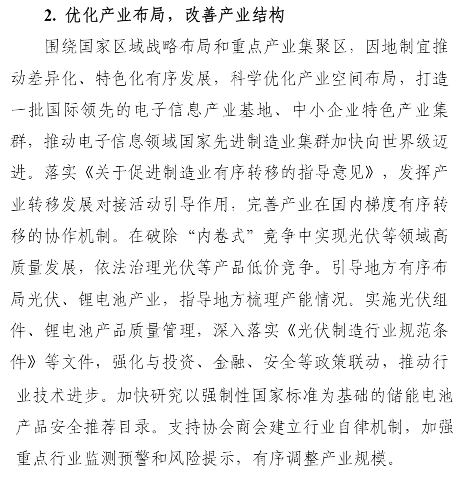 9月4日,工业和信息化部、市场监督管理总局印发《电子信息制造业2025-2026年稳增长行动方案》,方案指出,围绕国家区域战略布局和重点产业集聚区,因地制宜推动差异化、特色化有序发展,科学优化产业空间布局,打造一批国际领先的电子信息产业基地、中小企业特色产业集群,推动电子信息领域国家先进制造业集群加快向世界级迈进。落实《关于促进制造业有序转移的指导意见》,发挥产业转移发展对接活动引导作用,完善产业在国内梯度有序转移的协作机制。在破除“内卷式”竞争中实现光伏等领域高质量发展,依法治理光伏等产品低价竞争。引导地方有序布局光伏、锂电池产业,指导地方梳理产能情况。实施光伏组件、锂电池产品质量管理,深入落实《光伏制造行业规范条件》等文件,强化与投资、金融、安全等政策联动,推动行业技术进步。加快研究以强制性国家标准为基础的储能电池产品安全推荐目录。支持协会商会建立行业自律机制,加强重点行业监测预警和风险提示,有序调整产业规模。