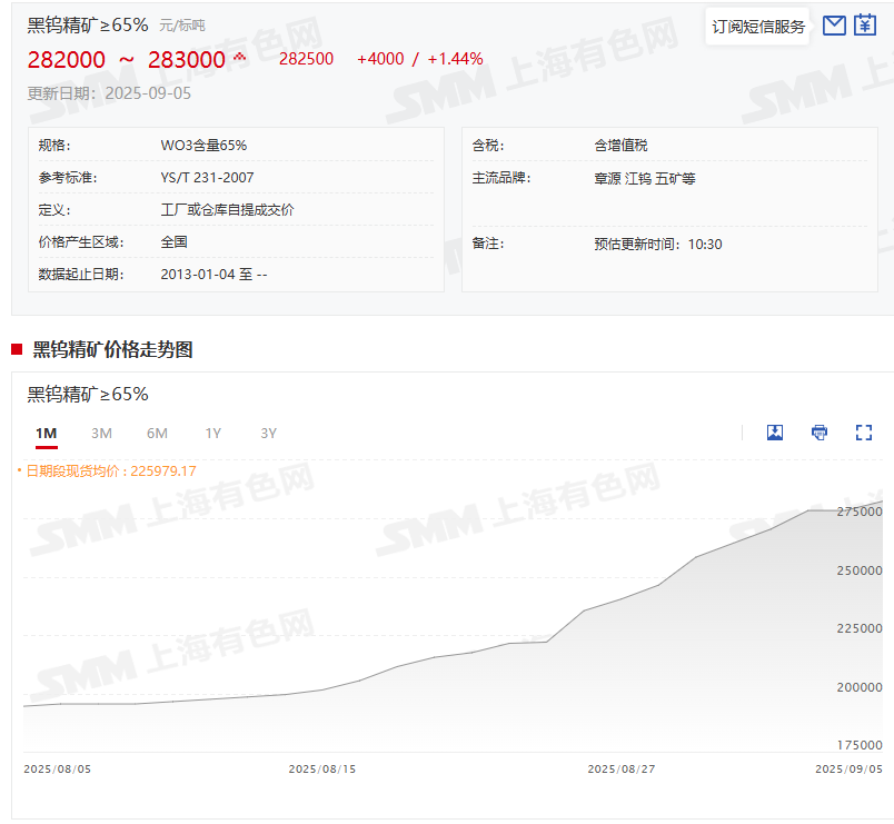 9月5日,黑钨精矿(≥65%)价格为282000~283000元/标吨,均价报282500元/标吨,较其前一交易日上涨1.44%,这也意味着黑钨精矿的历史新高记录再次被改写!而282500元/标吨这一均价与2024年12月31日的均价142750元/标吨相比,其均价今年以来上涨了139750元/标吨,今年以来的涨幅为97.9%。