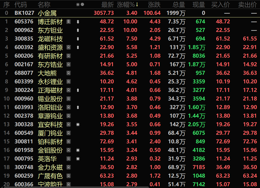 随着5G通信、人工智能、物联网等新兴技术的快速发展,对半导体芯片的需求持续攀升,这一趋势沿着产业链向上传导,进而带动了上游小金属原材料的需求增长预期;与此同时,钨价持续走高并迭创历史新高,钨价今年以来已涨近98%的涨幅为相关钨企的市场表现注入强劲支撑;此外,稀土永磁板块在政策端持续发力与供需结构优化的双重利好刺激下表现活跃,进一步为小金属板块的整体走强增添了动力。截至9月5日收盘,小金属板块涨3.4%,个股方面:博迁新材、东方钽业涨停,盛和资源、龙磁科技、有研新材、章源钨业、永衫锂业、东方锆业以及大地熊等涨幅居前。