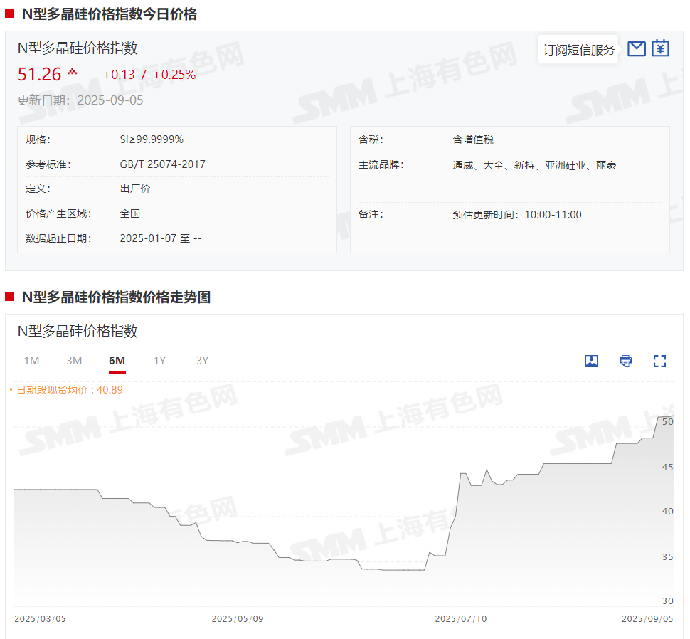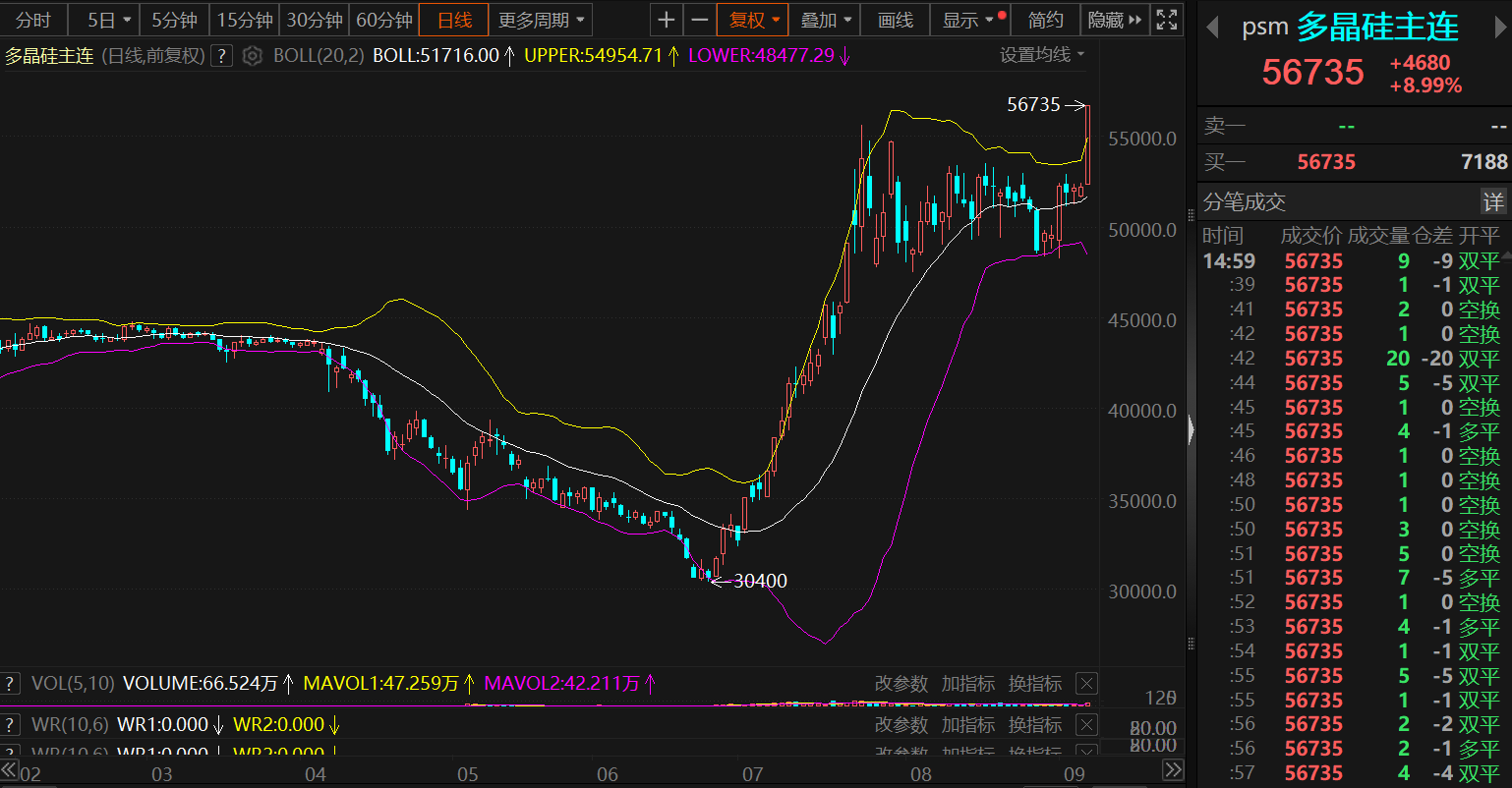 而9月首周,多晶硅现货价格再度迎来一波上涨,据SMM了解,此番上涨主要是受行业自律及市场交易带动。而政策面带动的“反内卷”政策再起,也令市场情绪再度提振,带动期货市场价格继续跳涨,9月5日多晶硅期货主连在临近日间收盘时成功拉升涨停,以8.99%的涨幅报56735元/吨,再刷其上市以来的历史新高!