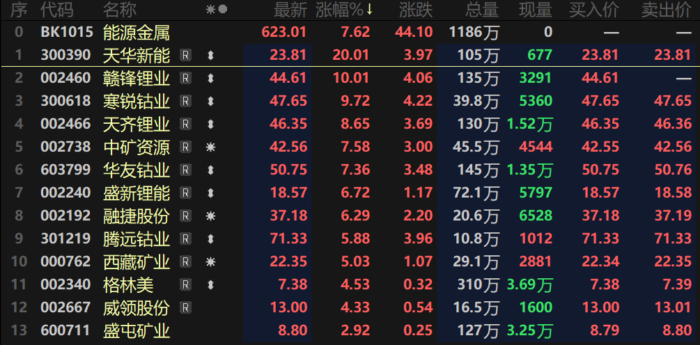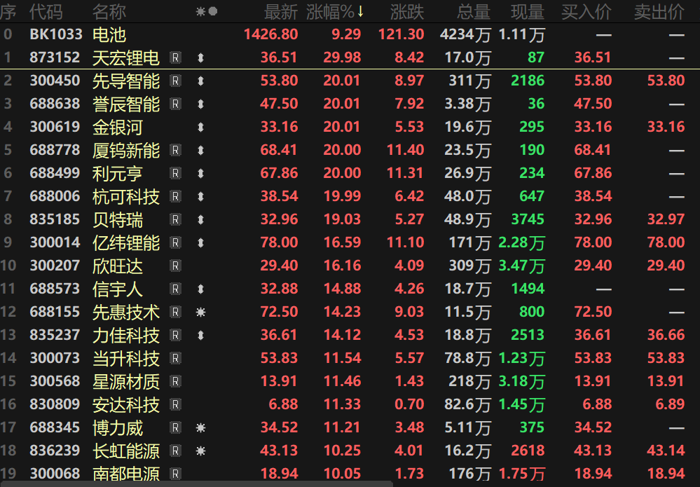 SMM 9月5日讯:9月5日早间,在国内政策面利好的加持下,电池、固态电池、能源金属以及光伏设备板块一同大幅拉涨,电池指数盘中更是一度涨逾9%。能源金属、光伏设备指数盘中也一同涨逾6%。各板块个股方面也涨势喜人。天宏锂电涨29.98%涨停,金银河、誉辰智能盘中20CM涨停,丰元股份、恩捷股份、天际股份也一同封死涨停板。