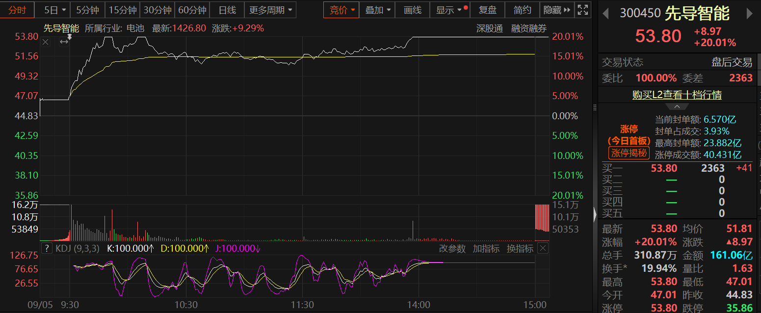 在今日电池及固态电池板块大幅拉涨的情况下,先导智能盘中一度拉涨逾20%盘中涨停,虽然期间涨停板打开,但临近日间收盘,先导智能依旧以20%的涨幅涨停封板!