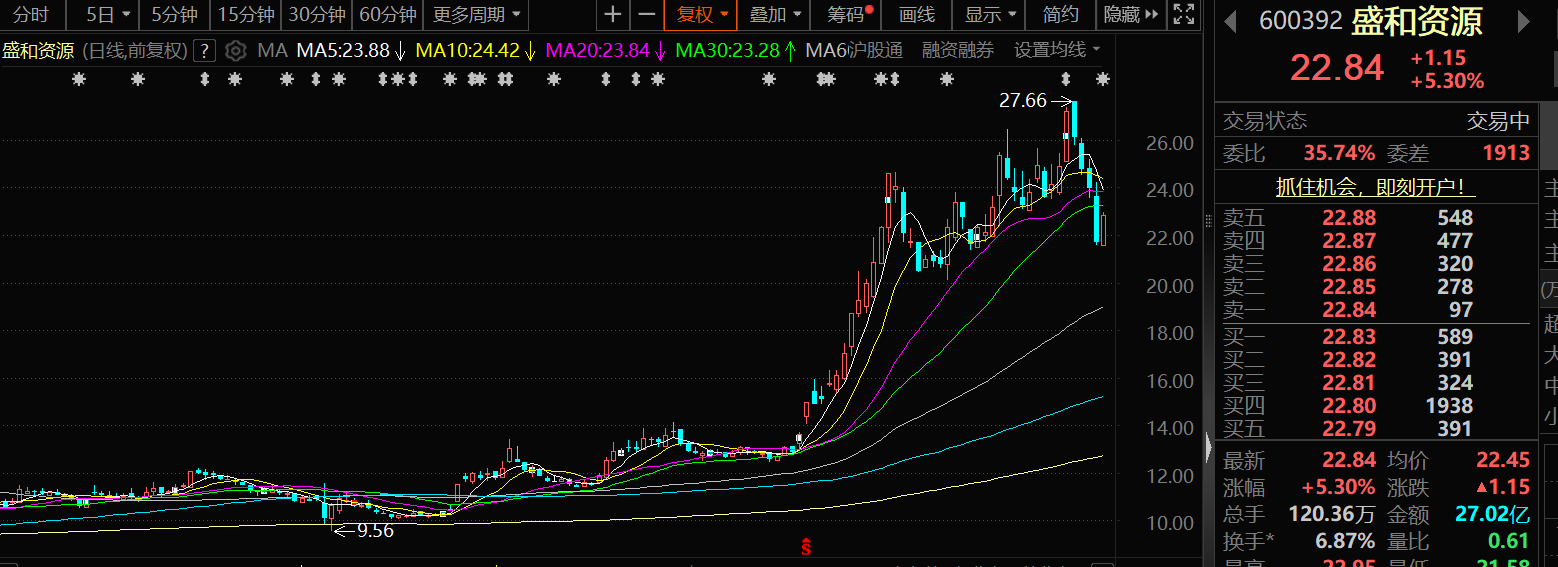 9月5日,盛和资源出现明显上涨,截至9月5日14:42分,盛和资源涨5.3%,报22.84元/股。
