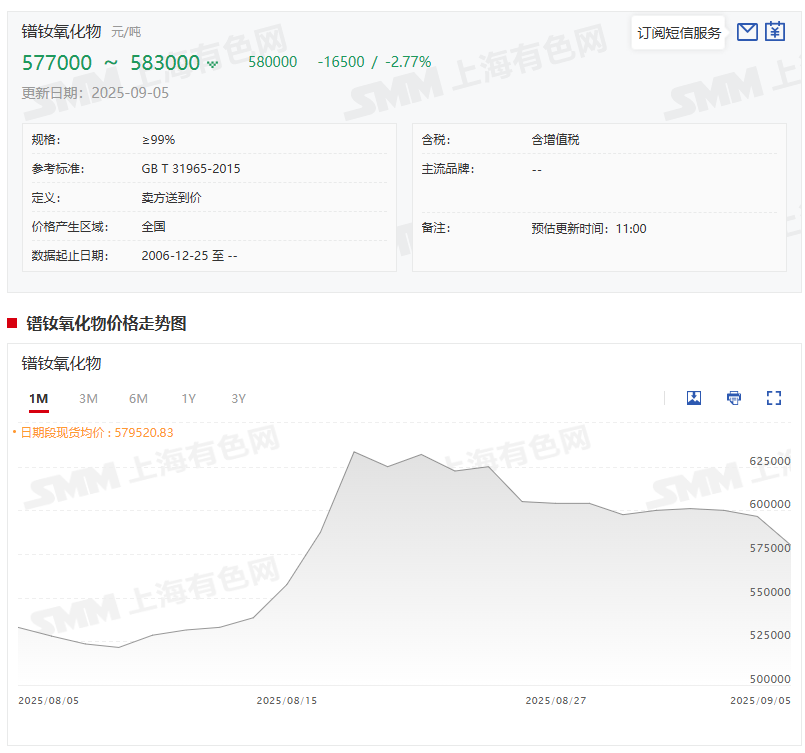9月5日,稀土市场价格整体呈现走弱趋势。具体来看,氧化镨钕9月5日的价格下调至577000~583000元/吨,其均价为580000元/吨,较前一交易日下调16500元/吨,跌幅为2.77%。580000元/吨这一均价与其6月30日的均价444500元/吨相比,仍然上涨了30.48%。而与2024年12月31日的均价398000元/吨相比,氧化镨钕今年以来上涨了45.73%。