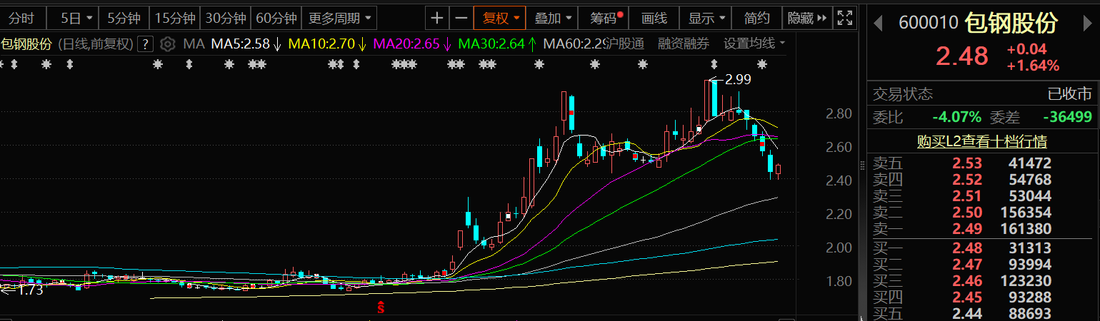 9月5日,包钢股份的股价出现上涨,截至5日收盘,包钢股份涨1.64%,报2.48元/股。