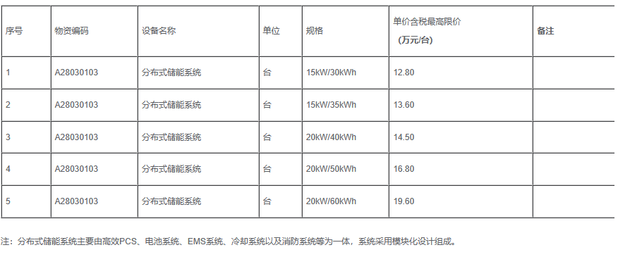 采购分布式储能系统规格分别为15kW/30kWh(限价12.8万元/台)、15kW/35kWh(限价13.6万元/台)、20kW/40kWh(限价14.5万元/台)、20kW/50kWh(限价16.8万元/台)、20kW/60kWh(限价19.6万元/台)。