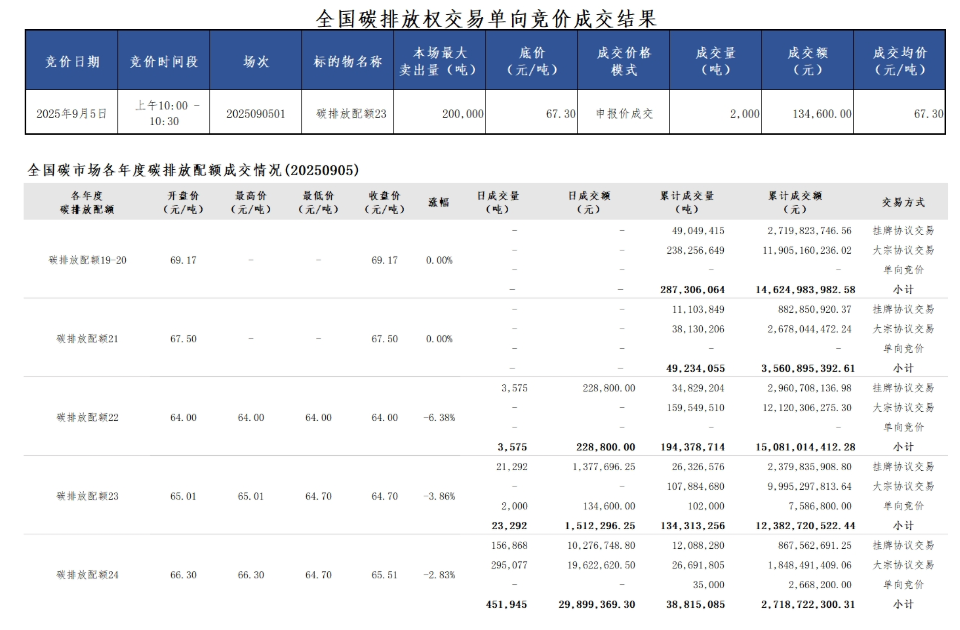 截至2025年9月5日,全国碳市场碳排放配额累计成交量704,047,174吨,累计成交额48,368,336,610.22元。
