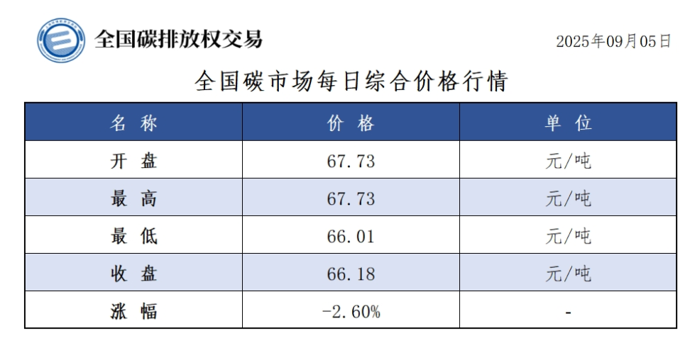 今日全国碳市场综合价格行情为: 开盘价67.73元/吨,最高价67.73元/吨,最低价66.01元/吨,收盘价66.18元/吨,收盘价较前一日下跌2.60%。