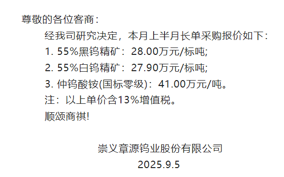 据崇义章源钨业9月5日消息:崇义章源钨业股份有限公司9月上半月长单采购报价如下:1. 55%黑钨精矿:28万元/标吨,较上轮报价上调6.9万元/标吨;2. 55%白钨精矿:27.9万元/标吨,较上轮报价上调6.9万元/标吨;3. 仲钨酸铵(国标零级):41万元/吨,较上轮报价上调10万元/吨。