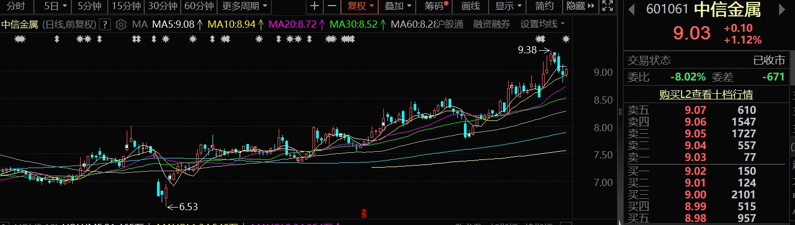 中信金属股价9月5日出现上涨,截至5日收盘,中信金属涨1.12%,报9.03元/股。