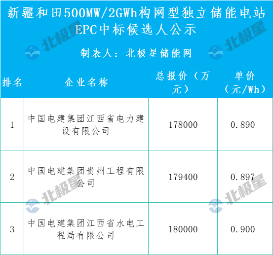 第二中标候选人为中国电建集团贵州工程有限公司,投标报价179400万元,折合单价0.897元/Wh;