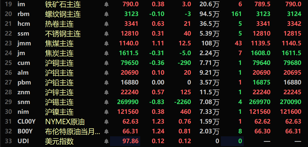 黑色系多飘红,铁矿涨0.38%,螺纹跌0.1%,热卷涨0.63%。不锈钢涨0.31%。双焦方面:焦煤主力合约涨1.11%,焦炭主力合约跌0.31%。