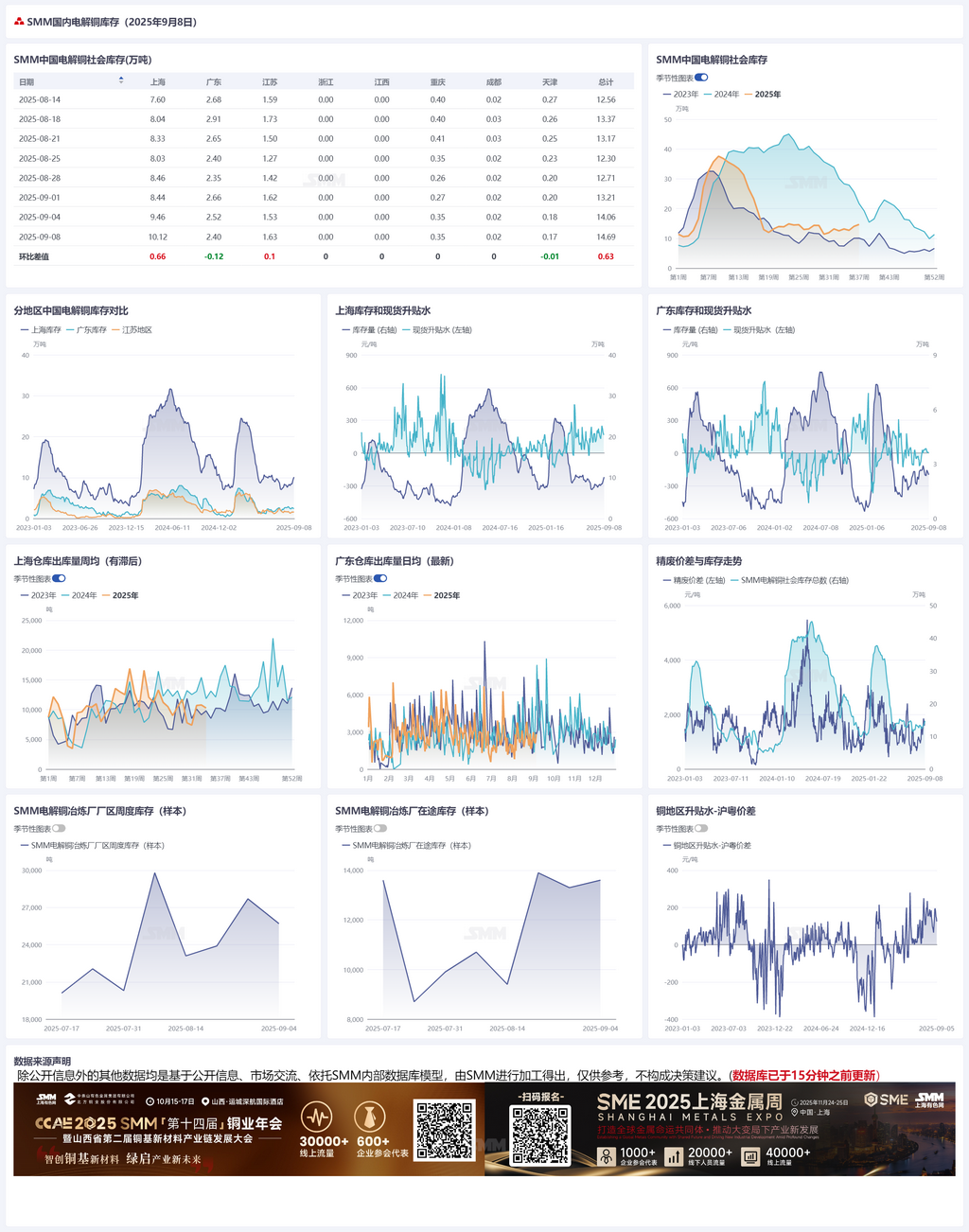 截至9月8日周一,SMM全国主流地区铜库存环比上周四增加0.63万吨至14.69万吨。除广东外各地库存均有所增加,总库存较去年同期的23.13万吨低8.44万吨。