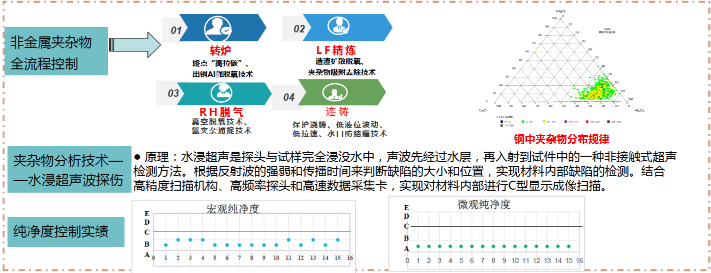 开展夹杂物全流程技术研究、分析及改善脆性夹杂物,采用水浸探伤技术开展研究,微观、宏观夹杂物指数控制可满足高纯净要求。
