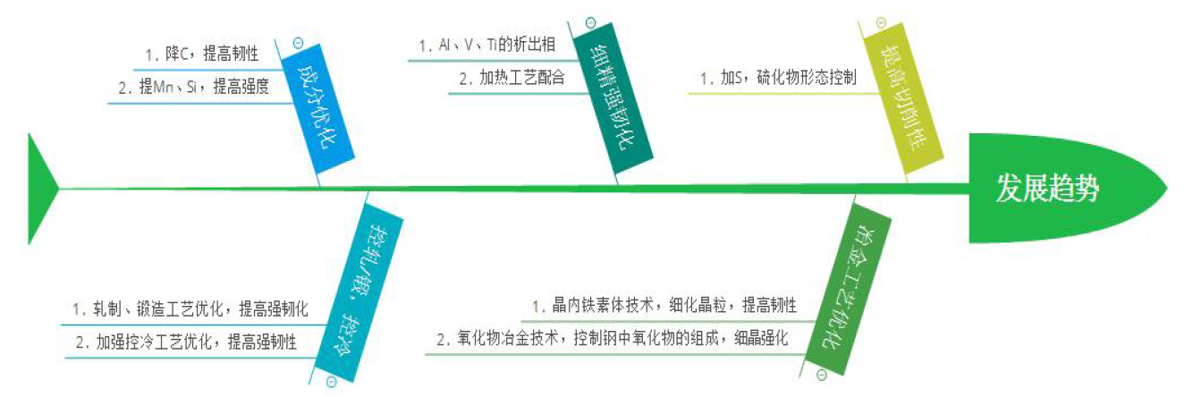 高强度、高韧性、易切削的非调质钢在汽车前轴、半轴、转向节、活塞、紧固件等的应用推广将是未来主要发展方向。