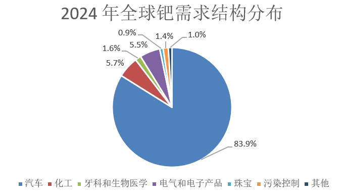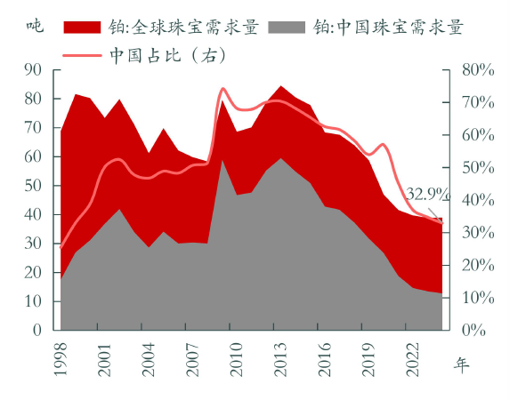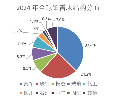 2. 需求全球领先:2024年铂金需求58.2吨(全球占比23.5%)、钯金需求77.4吨(全球占比39.2%),汽车催化(占比65%)、电子MLCC(占比15%)为核心需求;