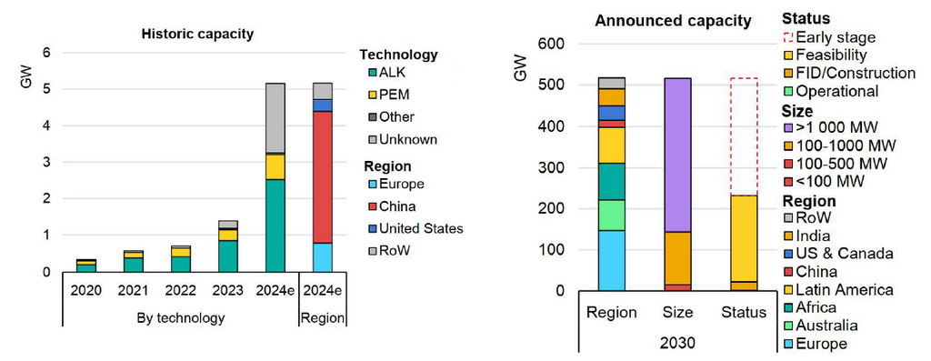 全球电解槽装机规模分地区及全球已公布的2030 年电解槽装机规模计划