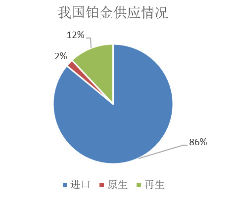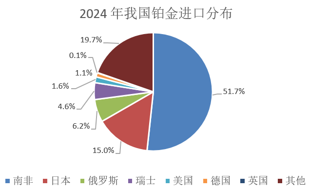 我国铂族金属储量不足全球的1%,矿床平均品位仅为0.796g/t,不足南非主要矿区的1/4,因而极度依赖海外进口。根据《中国铂钯统计年鉴2024》,进口铂长期占我国铂金供应的80%以上,2023年再生铂供应占比在12.3%,原生铂占比仅1.6%。进口量中,南非占比超过50%,日本占比15%,俄罗斯占比6.2%,若忽略统计口径差异粗略估算,来自以上三地的进口量合计约占我国铂金总供应量的63%。由于进口长期维持寡头垄断格局,国内铂金供应或长期面临进口风险。