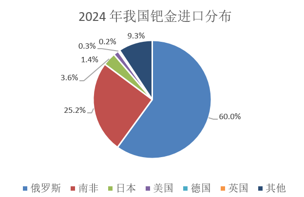我国钯金的进口依赖度虽不及铂金,但同样面临较大的进口风险。2020年以前,我国钯金进口比例多数时间在70%以上,2020 年起我国再生钯产量明显增加,这主要得益于回收技术的迭代应用以及汽车报废量的阶段性增长。2023年,我国进口钯供应占比下降至55.1%,而再生钯供应占比则上升至37.4%。分进口来源地看,我国约60%的钯金进口量源自俄罗斯,25%源自南非。以上两地合计占我国钯金进口总量的85%,约占我国钯金总供应量的47%,供应寡头格局同样形成长期进口风险。