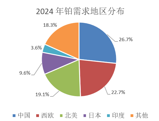 铂金的需求弹性较大,根据WPIC,过去十年需求的年同比增速在-10%~25%的宽幅区间内波动。若排除投资需求,2015年后铂金需求持续下滑,直至2022年探底,需求下降主要源于汽车和珠宝领域;汽车需求受到大众“排放门”事件以及纯电动汽车渗透率提升的双重冲击,珠宝需求则受到消费降级、婚庆市场不景气等因素的影响。而2023年铂金需求反弹,主要是由于混动车销量改善、“铂代钯”技术推广、以及投资需求的上升。2024年全球铂需求继续增加至247吨左右。铂金的行业需求结构相对分散,包括几大类:汽车需求,珠宝需求,工业需求,投资需求等。铂金的区域消费较为集中,中国是铂金最主要消费地,其次为西欧和北美,近年来新型市场如印度地区的汽车催化剂需求增长明显。