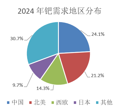 相比之下,钯金需求更为稳定,2020年以来年均需求量维持在230吨左右波动。2024年,全球钯金需求量为234吨左右。钯金的区域需求分布相对分散,中国依旧是主要消费国,其次为北美和西欧,俄罗斯虽占全球钯金供应的40%以上,但其本土消费量较低。钯金的消费分布十分集中,汽车催化剂需求可占到84%左右,高度依赖汽油车排放系统;而除投资需求外,工业需求与珠宝首饰等其余领域需求波动较小,因此钯金需求的弹性主要来源于汽车领域。近年来电车替代燃油车加速和“铂代钯”等因素压制钯金需求,预计2025年钯金需求将继续下降。