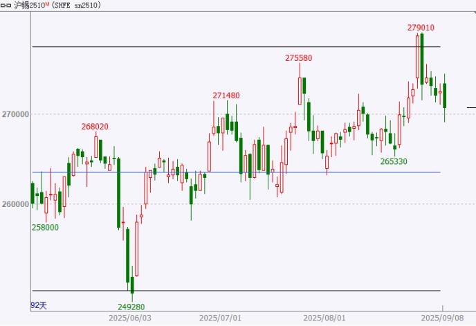 8月下旬海外低库存,强结构助力内外锡价偏强震荡,8月末国内头部冶炼企业停产检修的消息刺激沪锡价格最高上探279010元/吨,距离28万关口仅一步之遥,刷新四个月高位。不过,市场对锡业例行检修早有预期,且文华估值线显示期价高估,消息落地后,沪锡价格连续回落,今日盘中跌破27万关口,尾盘勉强收回,成交量显著放大,持仓量小幅下滑。
