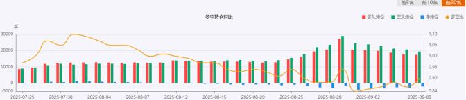 面对今日盘面下行,更多空头主力选择减仓。其中,国泰君安席位小幅加多54手,减空278手,净空持仓下降332手。与之操作类似的还有金瑞期货席位,加多160手,同时减空173手,净空持仓规模减少333手。此外,混沌天成期货、银河期货、中泰期货等席位减持空单均超150手。多头方面,主动加仓的席位为数不多,方正中期期货和海通期货席位分别加仓193手和160手。