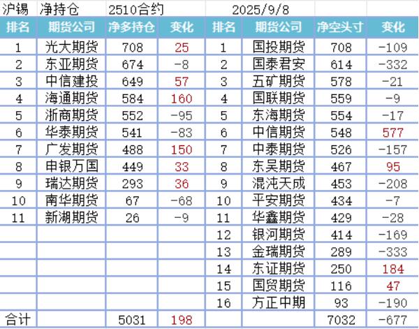 sn2510合约排名前20持仓龙虎榜中,多头合计减仓262手,空头合计减仓1137手,多空持仓比小幅抬升至0.9。具体席位上,中信期货席位减持多单413手,同时加空164手,净空持仓大幅增加至548手,成为今日持仓变化最为显著的席位,也是今天做空的主要力量。东证期货席位同样采取加空减多操作,空头敞口放大184手至250手。
