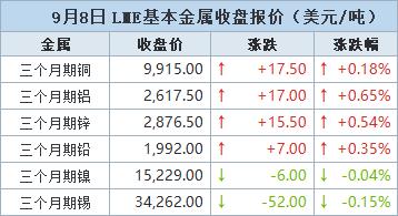 伦敦时间9月8日17:00(北京时间9月9日00:00),LME三个月期铜上涨17.5美元,或0.18%,收报每吨9,915.0美元。随着对美国9月晚些时候降息的预期不断升温,该合约上周触及五个月最高的10,038美元。