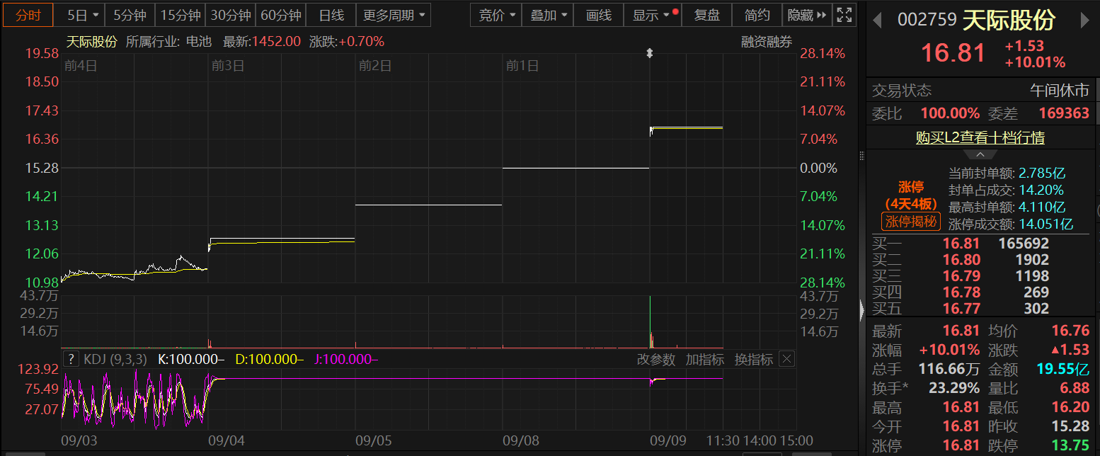 SMM9月9日讯:自9月4日以来,天际股份股价接连跳空高开,录得连续4个交易日的涨停,9月9日早间,天际股份股价再度开盘涨停,以10.01%的涨幅报16.81元/股,较其9月3日收盘的11.48元/股上涨5.33元,短短4个交易日涨幅高达46.43%。
