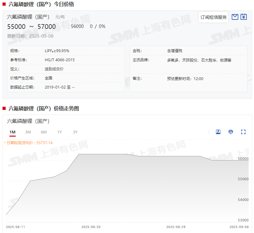 8月六氟磷酸锂的价格继续凭借原材料碳酸锂价格的上涨而持续上行,与此同时,下游需求转好也为六氟磷酸锂价格的上涨提供了一定的助力,综合因素推动下,六氟磷酸锂在8月19日达到8月高点56300元/吨,不过后续随着碳酸锂价格的小幅回落,六氟磷酸锂报价也有所下行。截至8月29日,六氟磷酸锂现货报价暂时持稳于56200元/吨。