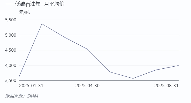 8月,低硫石油焦均价3985.5元/吨,环比上涨3.9%。供需层面,受终端企业备货需求释放带动,下游对低硫石油焦的采购积极性提升,市场出货节奏明显加快;同时,成本端对价格的支撑作用持续稳固。在成本上行和需求高企的双重驱动下,本月低硫石油焦价格呈现小幅上行态势。