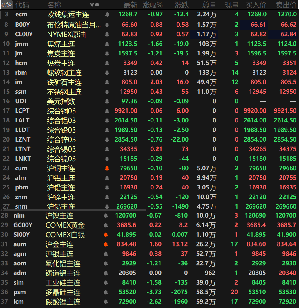 此外,碳酸锂主连跌2.62%,工业硅主连跌1.58%,多晶硅主连跌3.73%。欧线集运主连跌0.97%报1268.7。