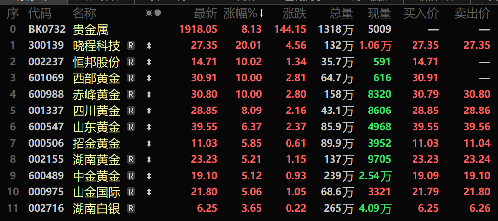 股市方面:贵金属板块9月9日出现暴涨,截至9月9日收盘,贵金属板块狂飙8.13%,个股方面:晓程科技以20.01%的涨停报收,恒邦股份、西部黄金、赤峰黄金涨停,四川黄金、山东黄金以及招金黄金等涨幅居前。