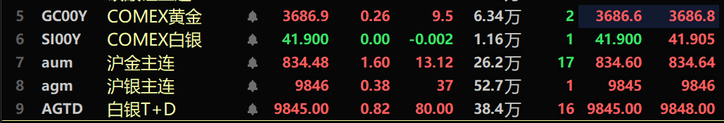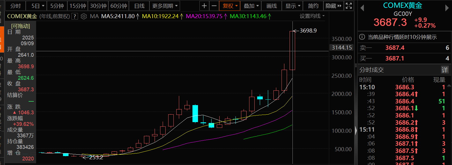 美国近来公布的非农等经济数据疲软、美元持续走弱,全球避险情绪升温以及多国央行持续增持黄金等多重因素发酵,贵金属期股近来多上涨,期货市场方面:截至9月9日15:21分,COMEX黄金涨0.27%,盘中刷新历史新高至3698.9美元/盎司,COMEX黄金今年的年线涨幅暂时为39.62%。其他贵金属期货方面,截至9日15:25分,COMEX白银平于41.9美元/盎司;沪金主连涨1.6%,盘中刷新历史新高至836.96元/克;沪银主连涨0.38%,报9846元/千克;白银T+D涨0.82%,报9845元/千克。