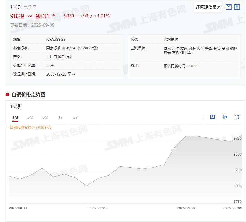 值得一提的是,SMM1#银9月9日9830元/千克这一均价与2024年12月31日的均价7440元/千克相比,其均价今年以来上涨了2390元/千克,涨幅为32.12%。