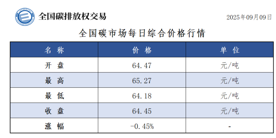 今日全国碳市场综合价格行情为: 开盘价64.47元/吨,最高价65.27元/吨,最低价64.18元/吨,收盘价64.45元/吨,收盘价较前一日下跌0.45%。