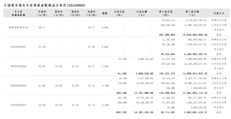 2025年1月1日至9月9日,全国碳市场碳排放配额成交量75,561,180吨,成交额5,448,270,566.61元。