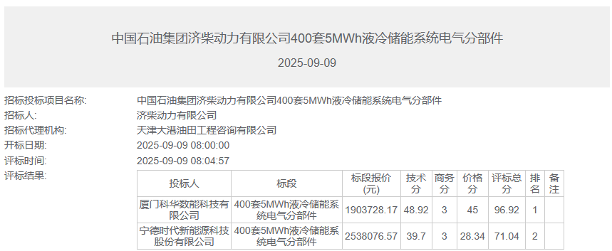 第二中标候选人为宁德时代新能源科技股份有限公司,投报价2538076.57元/套,整合单价0.508元/Wh。