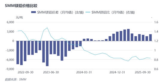 2023年1-8月数据显示,镁合金平均价格低于铝合金2230元/吨,镁铝比(镁锭/铝锭)平均维持在0.83的水平。