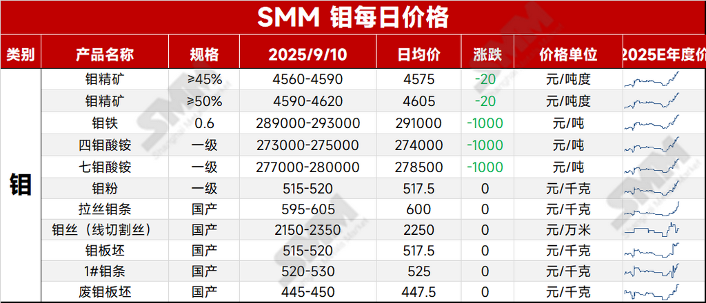 截止今日SMM45%钼精矿收报4560-4590元/吨度,SMM50%钼精矿收报4590-4620元/吨度,较上一交易日下降20元/吨度,受矿山复产消息影响,近期钼精矿市场成交价格小幅阴跌,部分贸易商出货积极性提高,为规避风险,多出货变现为主,市场流通有所好转,下游钼铁厂按需采购为主。