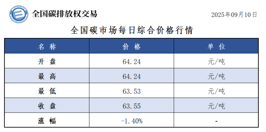 今日全国碳市场综合价格行情为: 开盘价64.24元/吨,最高价64.24元/吨,最低价63.53元/吨,收盘价63.55元/吨,收盘价较前一日下跌1.40%。